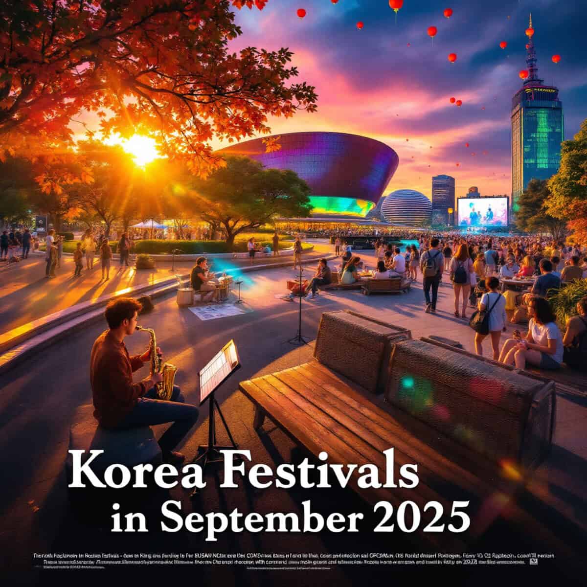 A vibrant festival scene in Korea during September 2025, showing international travelers enjoying music, film screenings, and traditional performances like mask dance. Include Busan Cinema Center, jazz musicians in a park, and colorful lanterns in the evening sky. Warm autumn colors, joyful atmosphere, flat modern illustration style. Text overlay: "Korea Festivals in September 2025".